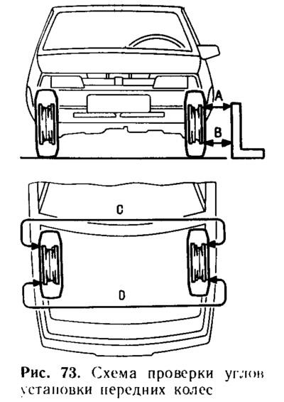 Контроль и регулировку углов установки передних колес рекомендуется проводить на станции технического обслуживания. Автомобиль устанавливают на горизонтальную площадку и нагружают в соответствии с рекомендациями завода-изготовителя (см. ниже). Проверка и регулировка углов на ненагруженном автомобиле допустимы, но дают менее точные результаты. Перед этим следует убедиться, что давление в шинах соответствует норме, износ протектора на левых и правых колесах примерно одинаков, отсутствуют люфты в подшипниках и рулевом управлении, колесные диски не деформированы (радиальное биение — не более 0,7 мм, осевое — не более 1 мм).